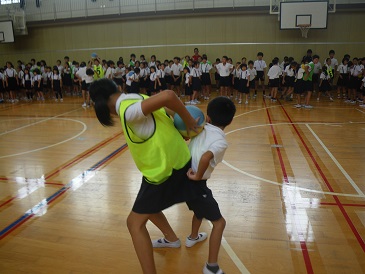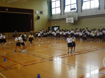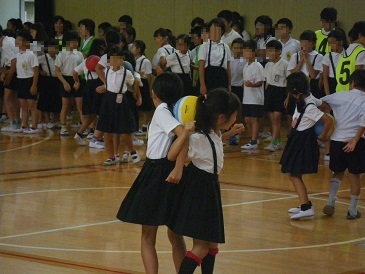 今日は、なかよし班(縦割り班)で2人一組で、背中にボールをはさんでボール運びをしました。異学年でも、背丈が同じだといいのですが、6年生と1年生のような背丈が違うペアは、6年生が1年生に高さを合わせて、運んでいました。