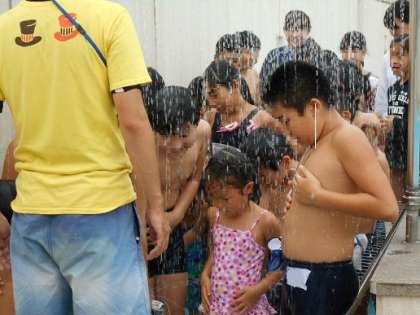 中本幼稚園の園児が小学校のプールに遊びに来ました。5年生の子ども達といっしょにプールで遊びました。