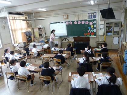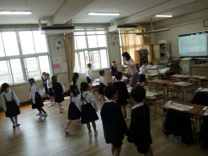 次は、教室の中を曲に合わせて音楽が速くなったら速く歩いたり、遅くなったときは合わせて遅く歩いたりして、流れてくるリズムをよく聞いて合わせることができていました。