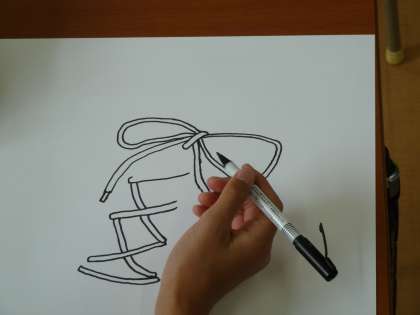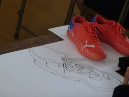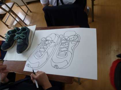 サインペンで靴を描き表した後は、色付けにとりかかる予定で、絵の具で色をつけている様子も今後お見せしたいと思っています。楽しみにしていただければと思います。