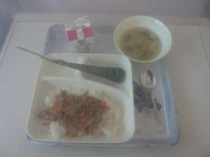 メニューは、きんぴらちらし、牛乳、すまし汁、ちまきです。