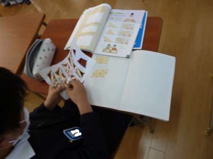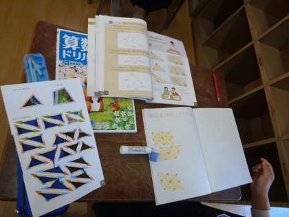 子どもたちは一生懸命、切り抜いた三角形をノートに並べてどう置けば隙間なくしきつめられるか考えていました。