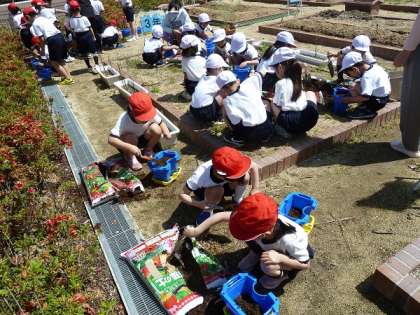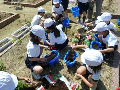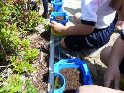1年生はそれぞれ自分の鉢に、土を入れて、肥料となるものをのせて、種を植えていました。土入れから、種まきまで全部自分で行いました。