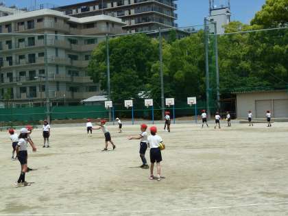 4年生の体育でラグビーボールを投げて受ける学習をしていました。