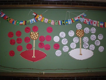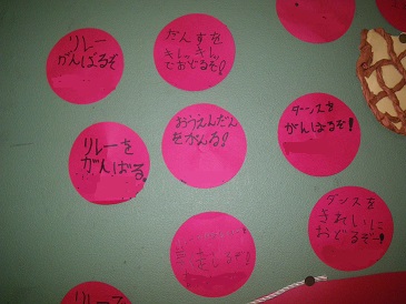朝の音楽、児童朝会の並び方、運動会の練習…。その中で、玄関掲示も運動会を盛り上げてくれています。今月の玄関掲示は「玉入れ」です。一つ一つの玉に、3年生の運動会に向けた思いが書かれています。