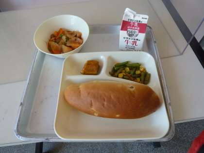 今日の給食は、おさつパン、牛乳、ケチャップ煮、さんどまめとコーンのソテー、焼きかぼちゃの甘みつかけ です。
