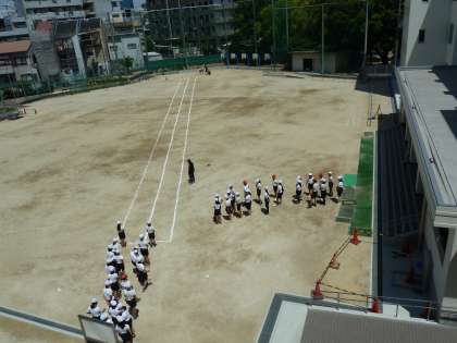 12日の6年の体育は、1組と2組が一緒に50m走の記録測定と全員でリレーをしていました。