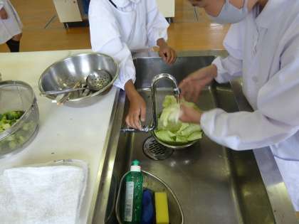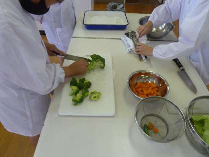 ブロッコリー、ニンジン、レタスの野菜のゆで方とドレッシングの作り方をこれまで学んでいて、今日はその実習です。