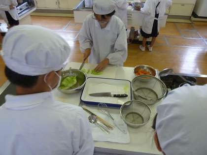 包丁を使って切る作業、ゆでるのに適切な時間を測って出来具合を確かめます。