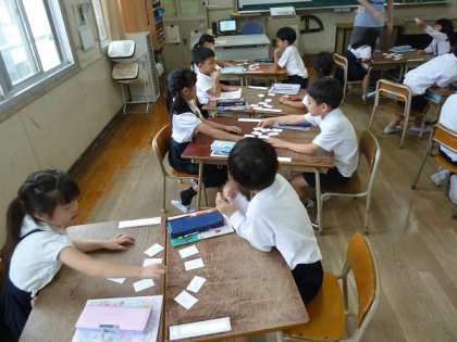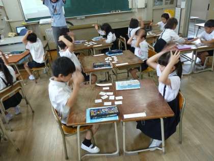 この時間は、先生が「3」といったら机の上にあるカードで「7」を見つけて取ります。