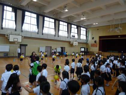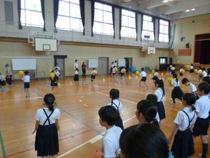 今日の児童集会は、三角コーンの上にボールを乗せて、印のあるところまで行って戻ってくるゲームでした。