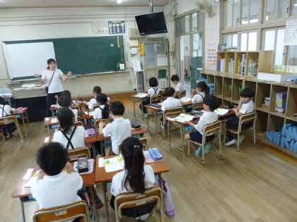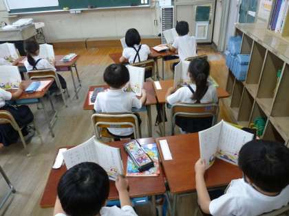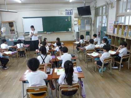 1年生の国語の学習です。先生が拍子でリズムをとって小さい「っ」のつく言葉をみんなで一斉に読んでいました。