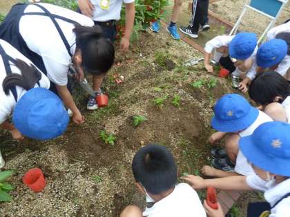3年生は学習園にホウセンカの苗を植えていました。
