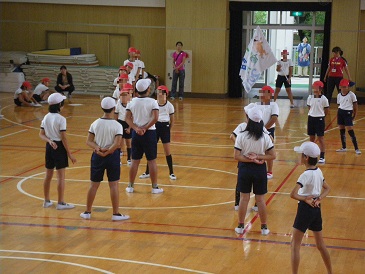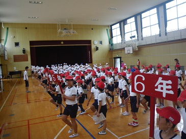 前日の雨で、運動場ではできませんでしたが、講堂で開会式の流れをみんなで確認しました。また、応援団といっしょに、応援の仕方も練習しました。