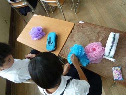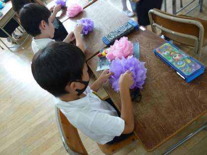 2年生の教室に入ると、子どもたちが色紙を使って花の形を作っていました。