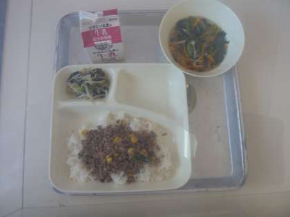 今日のメニューは、3色丼、3色スープ、3色酢のもの、牛乳です。