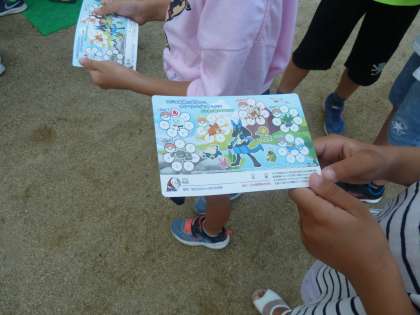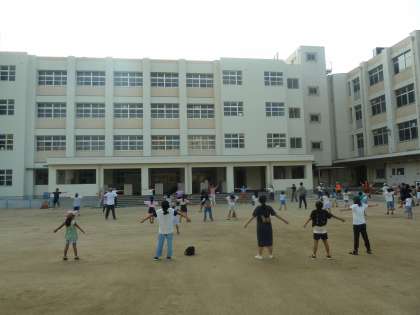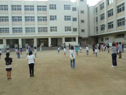 朝、6時半、中本小学校の運動場に子ども、お父さん、お母さん、地域の方などが参加して、ラジオから流れてくる曲に合わせてラジオ体操第一、第二を行いました。