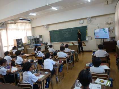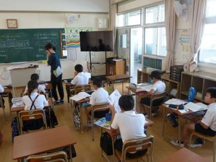 5年生は算数の学習です。1組、2組の教室で習熟度に分かれて学習しています。