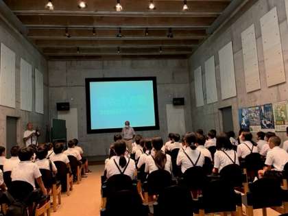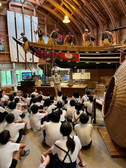 鳥羽の漁法をビデオにしたものを鑑賞した後、館内見学の説明を聞いています。