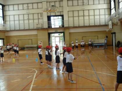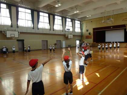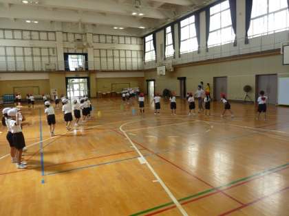 1年生の講堂での練習の様子です。隊形移動したときの自分の場所を覚えて、動きの確認をしていました。