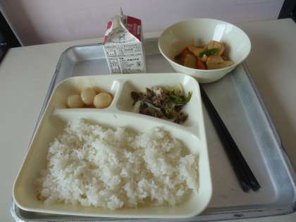 今日の給食のメニューは、月見の行事献立で「一口がんもとさといものみそ煮」、「みたらしだんご」、「牛肉と野菜のいためもの」でした。