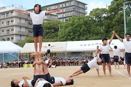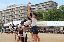 林間学舎をともに乗り越えてきた5・6年生。組体操で、さらに、その絆を深め、力を合わせ、心を一つに、感動の演技を見せてくれました。