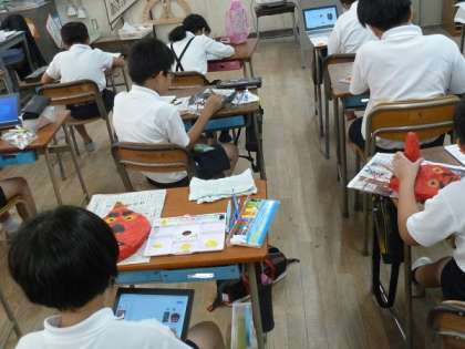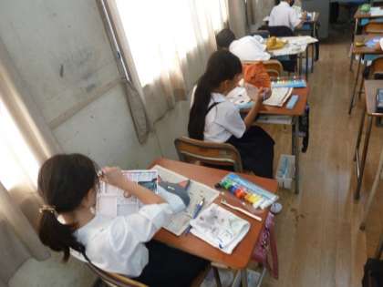 4年生の図工はお面づくりに取り組んでいました。作品も仕上げの段階に入り、色付けができてる児童もいました。