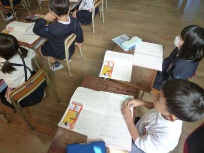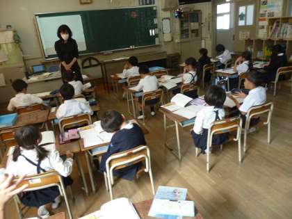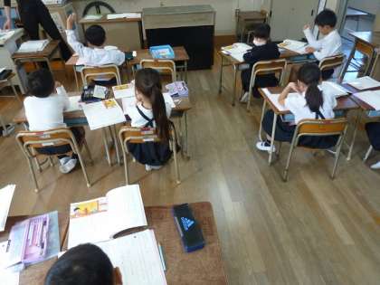 ワークシートを使って、それぞれの動物がサラダをどうしたらいいと言ったのかを書き出す活動をしていました。