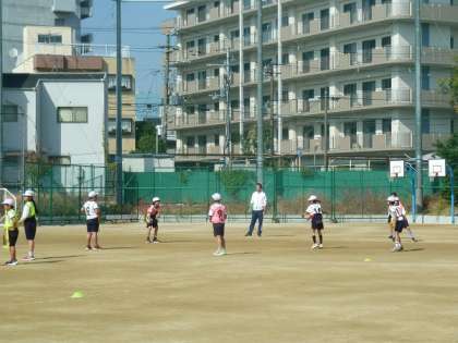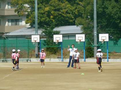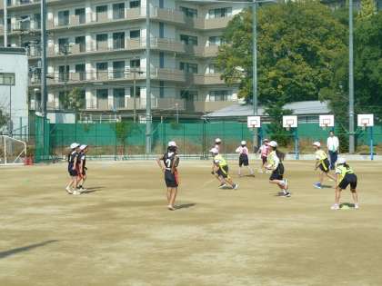 3年生の体育の時間の様子です。腰にフラッグをつけて、ボールをパスしながら前に進むゲームの練習を行っていました。うまく味方にパスをつないで前に進むためにどうすればいいか、それぞれチームで考えて試していました。