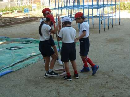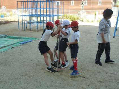 竹馬が倒れないように、みんなで竹馬を支えていました。