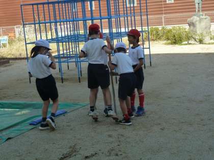 先日、2年生の子どもで、何人かが一緒になって竹馬に乗る練習をしていた時の様子です。