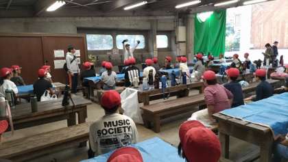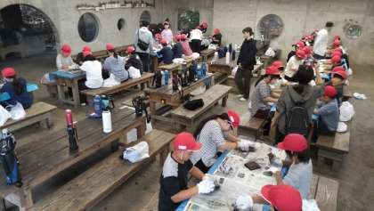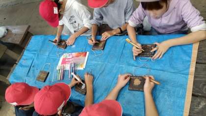 焼いてすすがついた板を一生懸命みがいて、自然体験学習の思い出の絵を描いています。