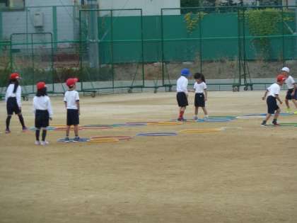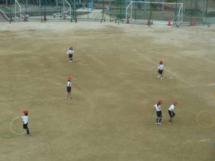 この日の1年生の体育はフラフープを下に並べて輪の中にジャンプして移動したり、輪を縦にして地面の上を転がしたりして楽しんでいました。