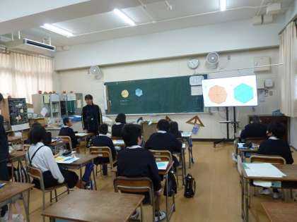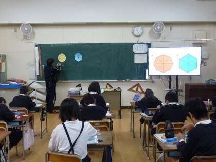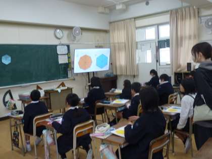 5年生の算数の時間の様子です。正六角形や正八角形の図形を見て、その特徴を見つけていく学習に取り組んでいました。