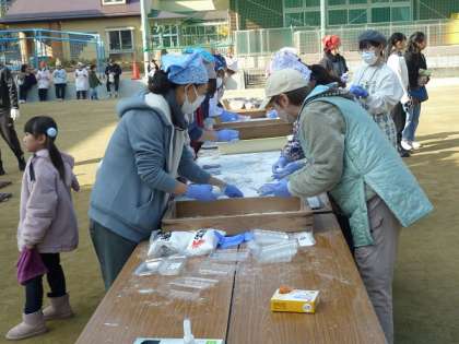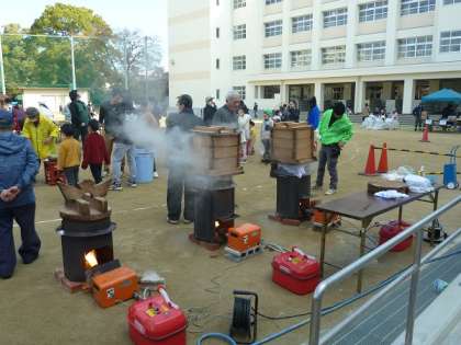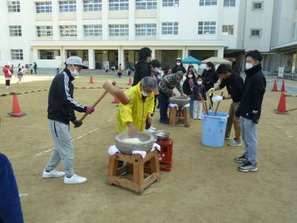 もちつきは準備がたいへんです。いろいろな機材の用意と準備、もち米をせいろで蒸かしたり、お湯をたくさん沸かしたりなど裏方にあたることに携わっていただいた方々のおかげで、子どもたちは日本の伝統であるもちつきに触れることができました。