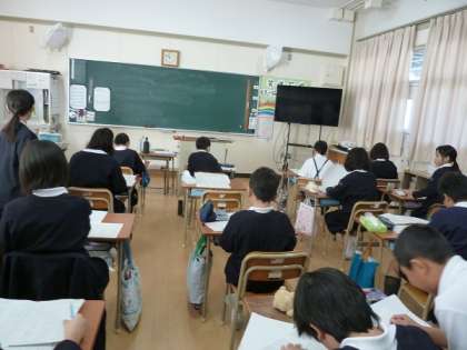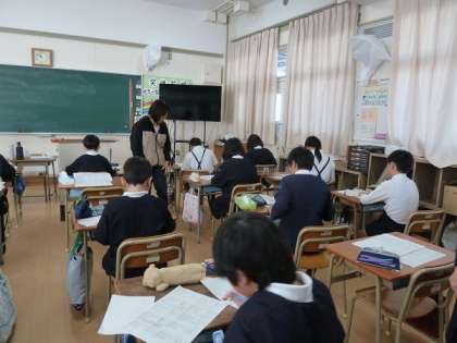 5年生の学習の様子です。クラスをよりよくしていくための意見を各自が原稿用紙に書いていて、それぞれが書いた意見文をみんなで読みあい、「意見と理由がはっきりしている」「構成がわかりやすい」「説得力のある文章だった」などの項目で評価していました。