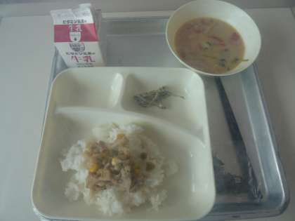 今日の給食のメニューは、れんこんのちらしずし、牛乳、雑煮、ごまめでした。