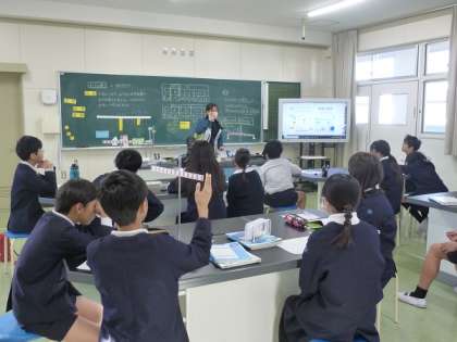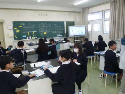 6年生の理科の学習の様子です。この日は、てんびんにつるす重さと距離の関係を実験を通して見つけていく学習でした。子どもたちは興味をもって実験の結果を予想しながら取り組んでいました。