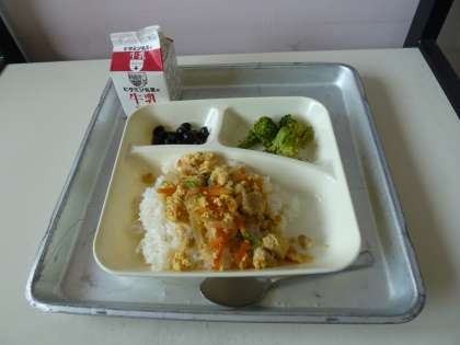 今日の給食のメニューは、親子丼、牛乳、ブロッコリーのごまあえ、黒豆の煮物でした。