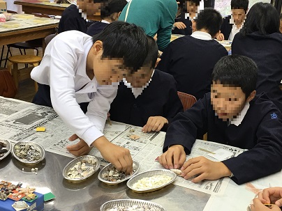 また、海の博物館では、旅の思い出にマグネットづくりをしました。材料は貝殻です。思い思いのマグネットをつくっていました。博物館の方からも「こんなに礼儀正しい6年生は初めてです。素晴らしい」とお褒めの言葉をいただくほどの見学態度でした。