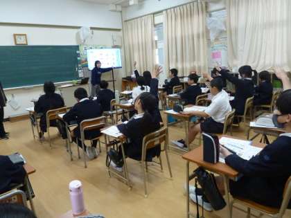 C-NETのエレノア先生との英語学習の時間です。担任の先生とエレノア先生とで役割分担を行いながら、子どもたちの学習指導に取り組んでいます。