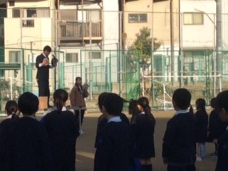 今日の朝、全校児童に朝会で紹介をしました。