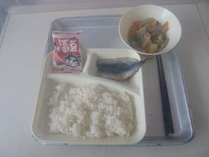 今日の給食のメニューは、ごはん、牛乳、いわしのしょうがじょうゆかけ、含め煮、いり大豆です。