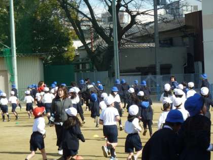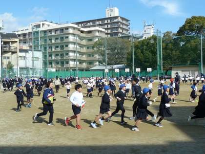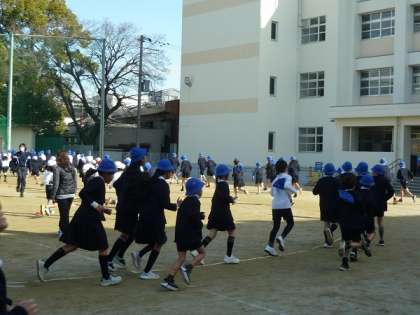 午前10時30分ごろの空気は冷たくて気温が高くないのですが、子どもたちはがんばって走っていました。5分ほどの時間ですが、走っていると体の中からあたたかくなってきている様子が見えました。