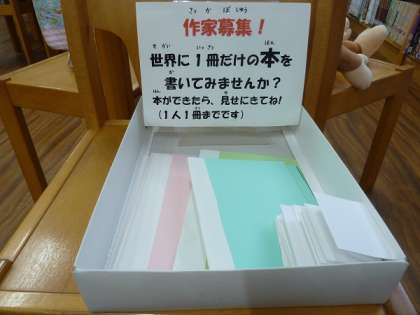 図書室には、「世界に一冊だけの本をかいてみませんか?」というポップがあり、子どもたちがそのために使う用紙が置いてあります。