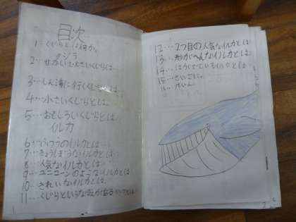 その横には、「世界に一冊だけの手作りの本を作りました」と書いてあり、中本小学校の児童の手作りの作品が展示されています。表紙を見ると、バーコードや書籍番号?がついていたり、発行会社名があったり、後表紙には定価が書いてあったりとすごく本についてよく知っているなあと感心します。