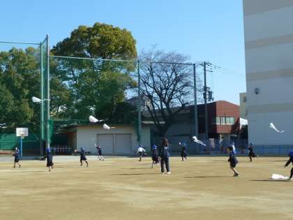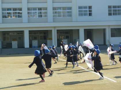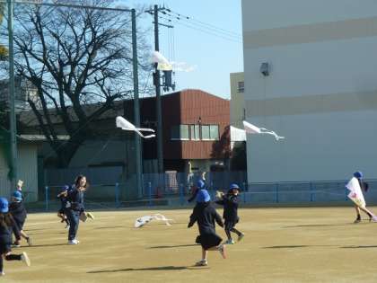1年生の子どもたちが運動場で、たこあげをしていました。