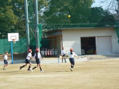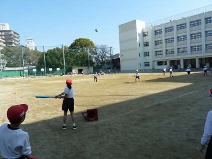 ボールはドッジボールの大きさに近いボールを使って、プラスチックバットで打っていました。さすがに思い切り振りきったバットに当たってもボールはそう遠くまでは飛びません。またボールが大きいので取る方もとりやすく、攻撃でも守備でも楽しそうに取り組んでいました。