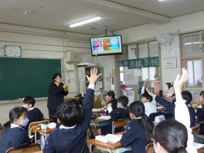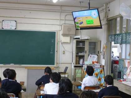 1日の生活で朝起きた時刻、朝の歯みがきの時刻、朝ご飯の時刻などをエレノア先生が子どもたちに英語で尋ね、その時刻を子どもたちが答えています。