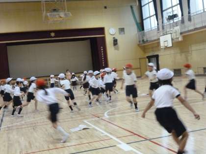 先生が「バイク」と言うと、バイクを運転している動きを表して、体育館の中をかけまわります。「ショベルカー」というのもありましたが、子どもたちは土を掘り起こして力強く動く様子を表していました。